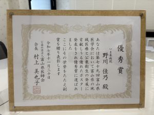 当院の研究発表チームが、昨年に続いて富山県医学会(公益社団法人富山県医師会主催)において『優秀賞』を受賞しました。